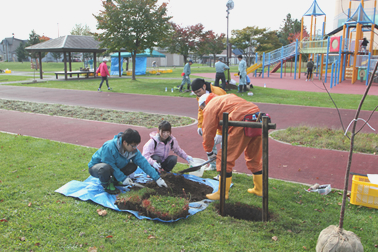 総勢47名で植え替えも含めて70本の桜を汗だくになりながら行いました。今年は天候にも恵まれ気持ちの良い空の下、順調に植樹を終え、差し入れの豚汁をみんな笑顔でいただきました。桜もすくすくと育ってくれるよう願っています。