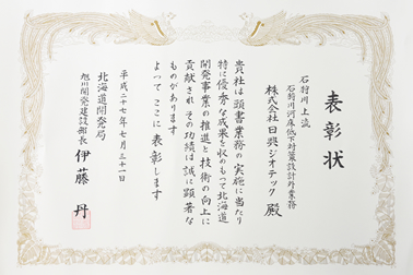 平成26年度に完了した業務2,623件を対象に選考し、この度、石狩川上流石狩川河床低下対策設計外業務が旭川建設部長表彰を受賞しました。