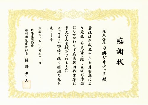 昨年の7月、北海道各地で豪雨による河川の氾濫や土砂災害が発生しました。この度、旭川地区の災害への応急対応、復旧作業、各種調査等に多くの団体等が協力したという事から、この度当社も旭川開発建設部長から感謝状をいただきました。