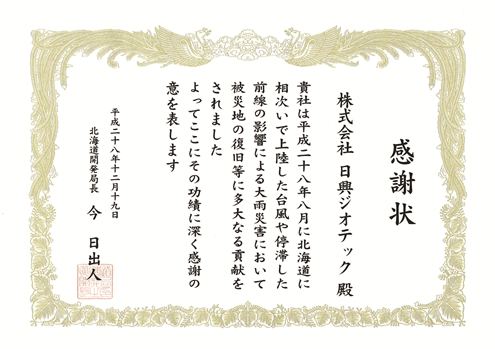 今年北海道では8月以降記録的な大雨となり、河川の氾濫や土砂災害が発生しました。災害への応急対応、復旧作業、各種調査等に多くの団体等が協力したという事から、この度当社も北海道開発局長から感謝状をいただきました。