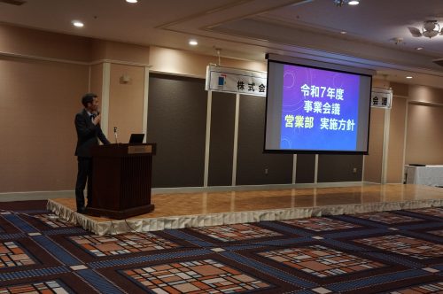 前年度の事業報告と今年度事業・運営計画、新入社員紹介や永年勤続表彰、各部署の目標・推進策を発表し、